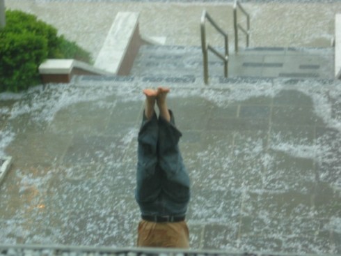 • As a gentle yoga class takes place inside the Main Hall, I sit in the lounge, eyes fixed on the ominous gray/black clouds rolling this way. Thunder sounds, a flash of lightning, and then … HAIL! Hail the size of mothballs, setting off car alarms, collecting on top of the picnic table canopies, collecting in the pools in the valleys on the front lawn. Crazy folk run outside to do handstands on the ice and make “hail angels.” The echoes of thunder sound like a giant celestial, threatening hand breaking planets, crushing entire forests of redwoods in one fell swoop, drawing out the destruction bone by bone, trunk by trunk. Bits of planet falling to Earth. Lightning that sounds like a shotgun, the brightness!, wondering just how safe my little comfy second-floor lounge seat really is. I sit and watch a thunderstorm for nearly an hour: 60 minutes of nothing but staring out a window.