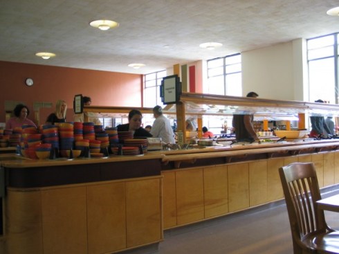 • Silent breakfast observations: Blue, yellow, and salmon-colored bowls greet guests, with matching plates as well. Cling-clang of silverware. “Moonlight Sonata” in the morning as the sun struggles to break through the misty veil that shrouds our monastery. The crackle of ice falling into plastic mugs, dirty plates stacked in the dish return queue, leftover food sliding into the compost bins.