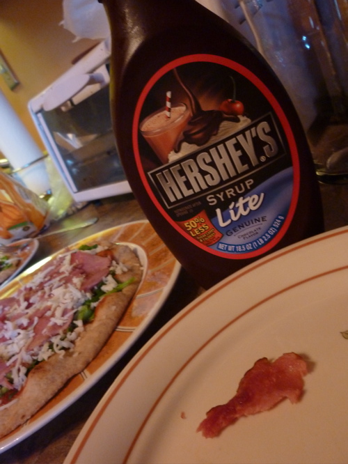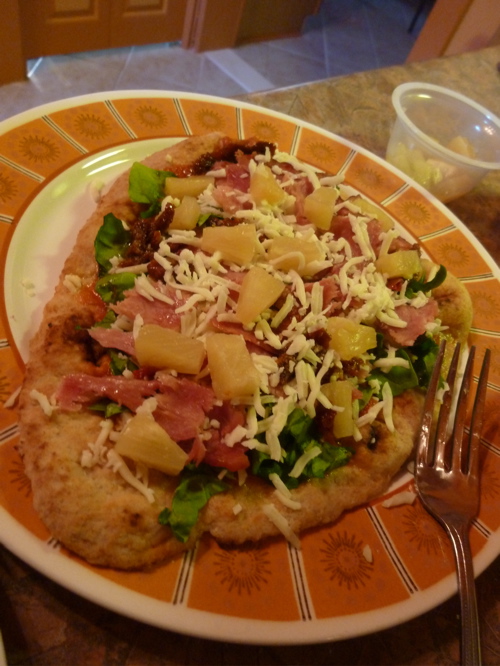 It started so innocently with whole wheat naan pizza. Toppings: tomato sauce, shredded mozzarella cheese, spinach, sundried tomatoes, pineapple…and bacon.