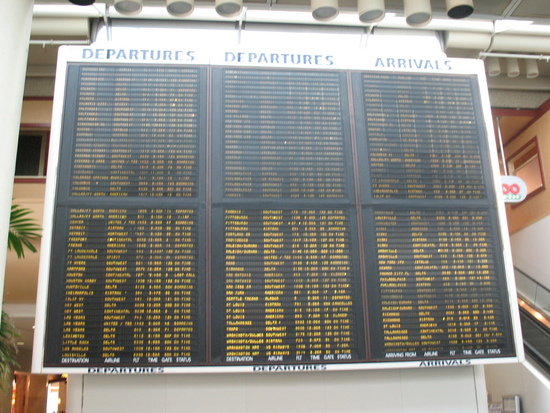 So you can imagine my disappointment when, several years ago, my beloved flippy screen became a victim of technology and was replaced with several flat-panel televisions. They’re boring. They just sit there. When a flight status changes, in just a blink of an eye, the wording goes from “Boarding” to “Departed.” Like that! No sound, no anticipation of where the flippy board will end. It’s like getting a scratch-off lottery ticket and finding that the numbers appear by themselves without you having to grind a penny into the card and brush the metallic crumbs off your kitchen counter. Yes, it’s quicker, but what’s the fun in that?