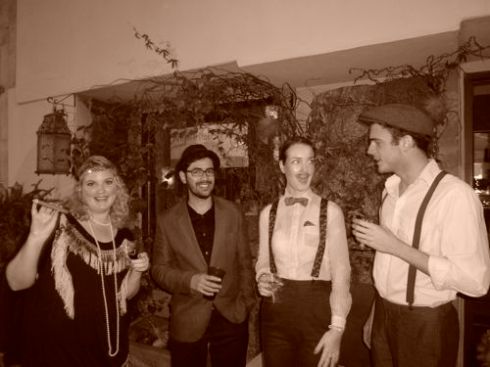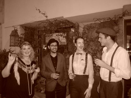 Since I’m an early riser and not much of a night owl, I was concerned about my ability to stay peppy during a party that didn’t start till 8 (I know–I’m such an old lady!). Amazingly–between the drinks, food spread, great music selection, and crowd–I was on my feet till the party ended at 1. My sister’s boyfriend is a DJ and knew how to pick out the jams, most of which stuck to the ’20s/early ’30s theme. It helped that most of my sister’s friends are theater people (as was I in high school/college), and so the whole night felt like a stage show. Give us costumes and choreography, and we’re set! In fact, they played “All That Jazz” from Chicago twice, and we ended the night belting away and hoofing it like Velma and Roxy.