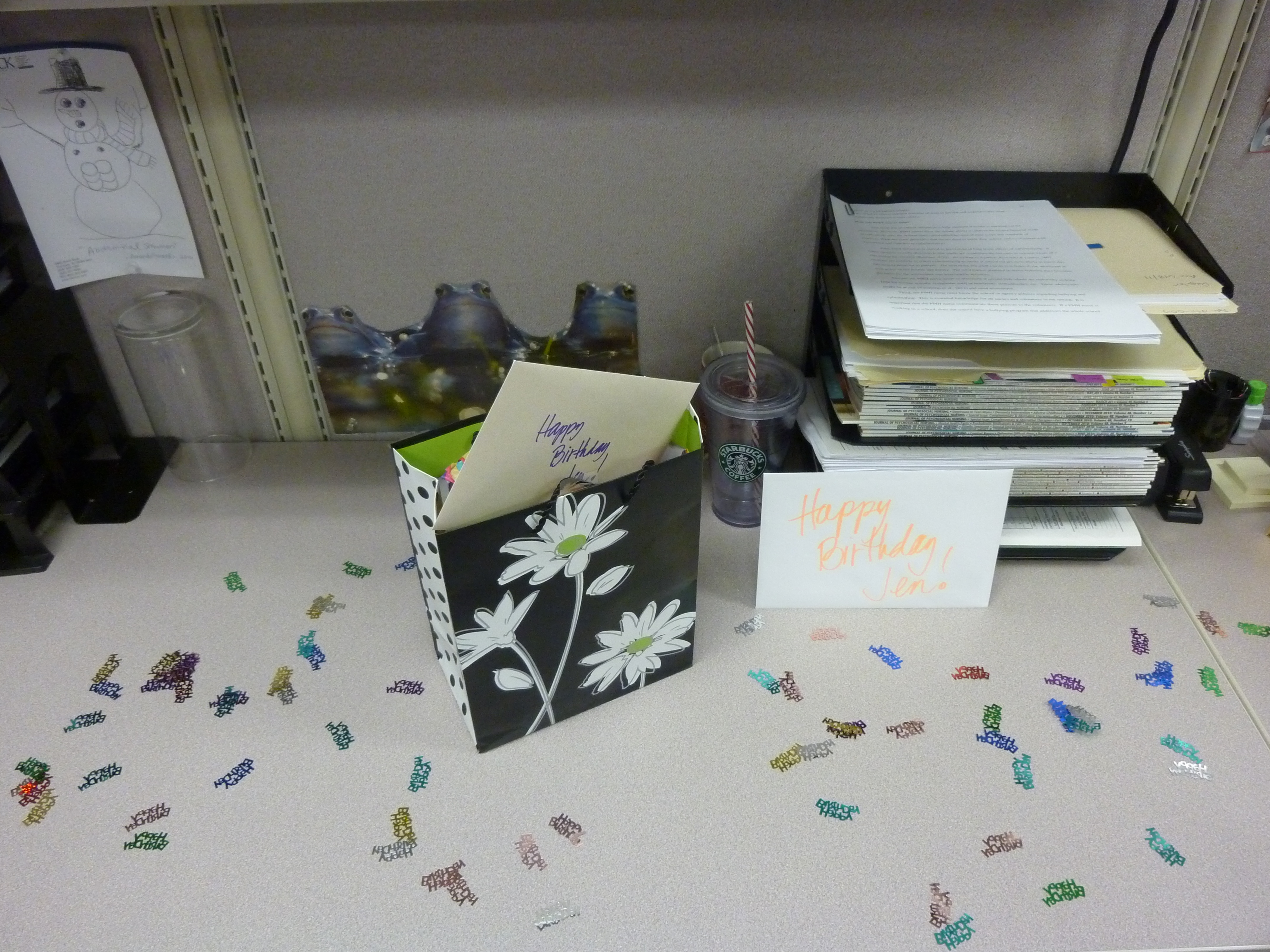Thursday was my office birthday celebration, which meant my manager brought in the treat of my choice (brownies!) and decorated my cubicle with the “Happy Birthday” confetti.