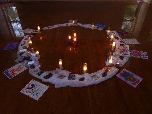 Yes, this beautiful centerpiece—which so perfectly represented the fifth circle of a mandala, the ether—was making me anxious. Now, at the time of our dancing it did not have the candles or paintings, but it was still a giant piece of real estate on which we could not dance.