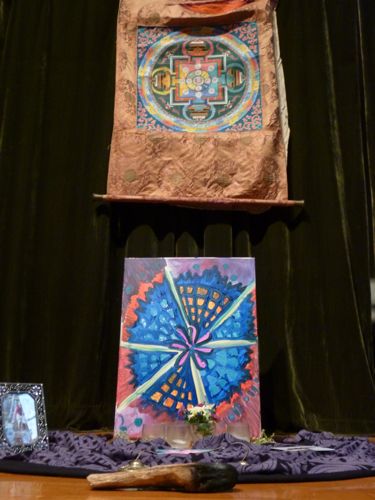 Well, the event was way more than a little dancing, a little painting. The workshop’s organizers—Nancy, Stavros, and Johanna—created such a sacred space that I was reluctant to even bring my cheap plastic water bottle into the transformed grade-school auditorium. Ivy-like garland lined the room’s perimeter, each corner containing an altar dedicated to one of the elements. Fellow dancer Phil consecrated our quarters by offering a fragile, authentic, handmade mandala thangka from India as decoration with a purpose: