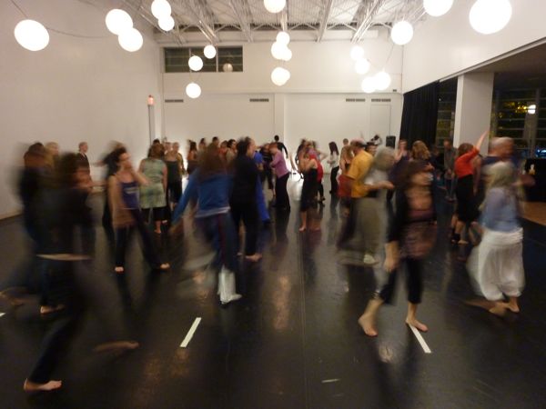 Instruction is very loose during 5Rhythms, and most of the class is self-led, an invitation for students to explore their own movements and personalities. As mentioned earlier, those used to detailed instruction may feel self-conscious at first, thinking they are doing something wrong or that they should be doing what that guy is doing. I find that it’s much easier to move with my eyes closed at first, pretending I am in my living room at home, dancing to the radio. Copying others’ movement is also encouraged if you’re having difficulty getting in touch with your own rhythm; sometimes doing someone else’s move for just a few seconds will create an Aha! moment in yourself, and suddenly you’ll launch into your own pattern without even thinking about it.