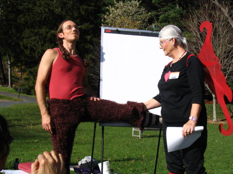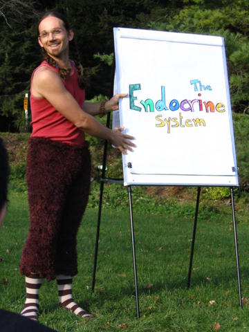 The teachers take our afternoon session outside for an anatomy/physiology lesson. What troopers–they all dressed up for Halloween and put on a “play” about the different systems of the body. We sat on the east lawn and watched Helga play the circulatory system, Jurian the nervous system, Leila the respiratory, Megha the digestive, Rudy the lymphatic, and Roger (dressed in wooly fur pants) the endocrine. How these people got Helga to wear wings is beyond me.