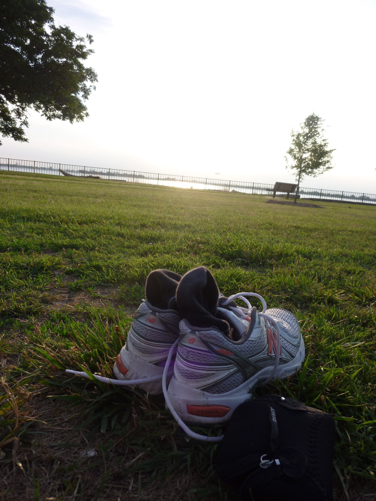 I did some basic yoga stuff (lots of sun salutes), but I had on my iPod and the music was calling for me to dance. I did stand on my yoga mat and do a lot of dance-inspired asanas, but the sprawling lawn, glowing sun, sparkling river, and overall beauty of the day were just begging me to bust out some free-form moves. I’m ashamed to admit I was held back by fear of what others in the park would think of me, this girl dancing in the grass. My body ached to express itself in such a picturesque environment, and even though I felt insulated by the iPod ear buds that separated me from any passersby’s comments, I held back and did not dance how my body was requesting to. I moved and grooved with reservation; it was nice, but not 100% fulfilling. How come I think it’s acceptable for someone to sit on a park bench and play the guitar while singing along, but I fear that dancing is totally weird? Argh. Still, a pretty decent combination of random stuff that made me sweat and get my heart rate up.
