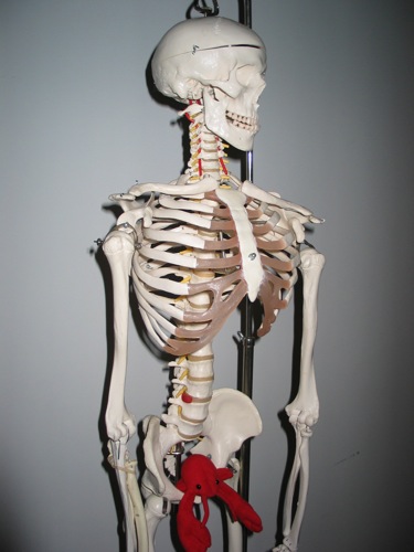 Our afternoon session was another anatomy and physiology class with Peggy, during which we stuck stickers all over our 22 major muscles. D and I were partners and were both ridiculously exhausted and unenthusiastic. Peggy wrapped cold spaghetti noodles in Saran wrap to demonstrate muscles and how they work. The skeleton fell off its stand and collapsed in her arms. We went into savasana as Peggy recited the names of our muscles.